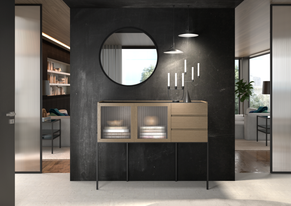 La combinación de materiales de las patas de hierro, los frentes de vidrio de las puertas y la madera del mueble hacen de esta una consola original.