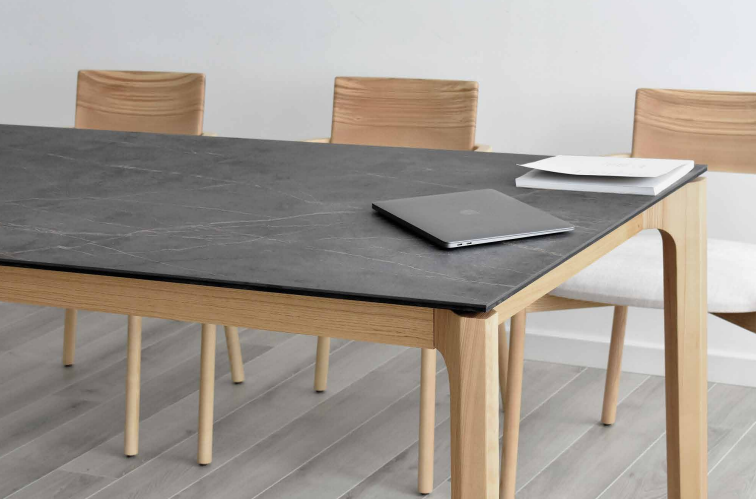Disponible en diferentes tonos de roble, nogal y lacados, así como tapa porcelánica.