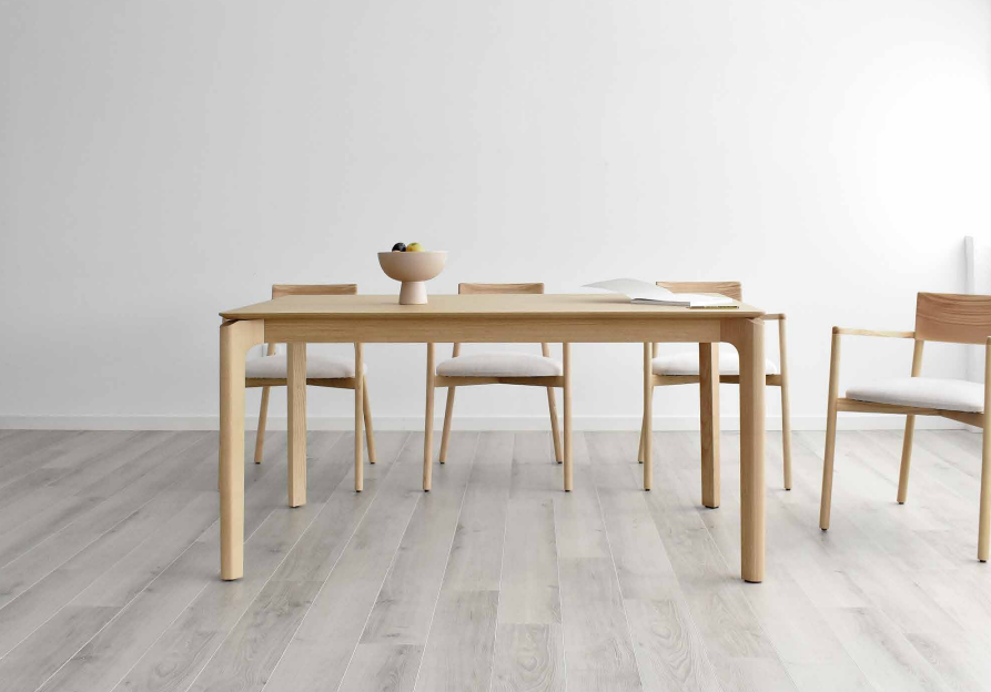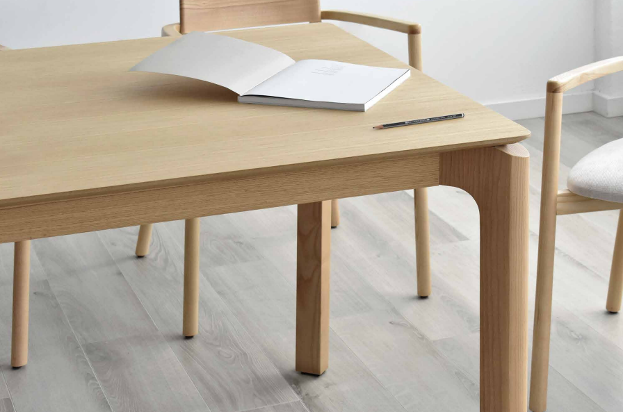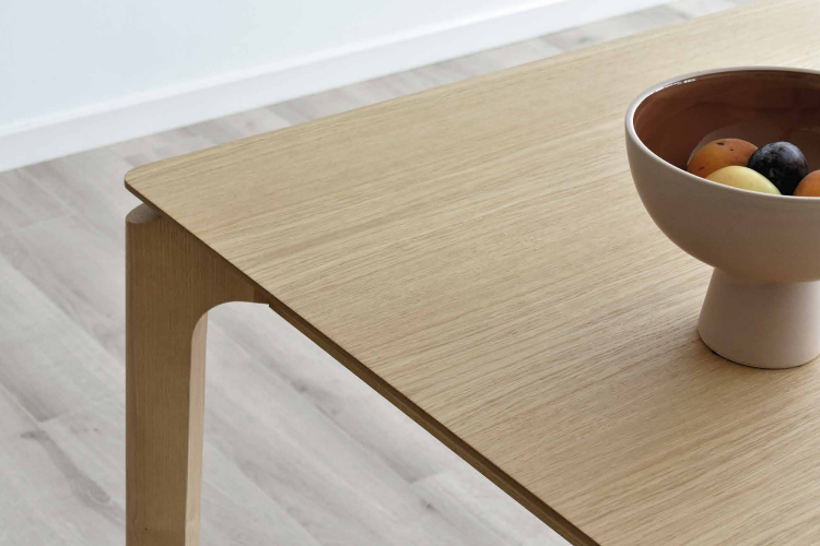 El roble claro hace de esta una mesa de comedor acogedora y atemporal con clara inspiración del estilo nórdico. Las patas curvas en la parte superior contrastan con el resto de las líneas rectas del mueble.