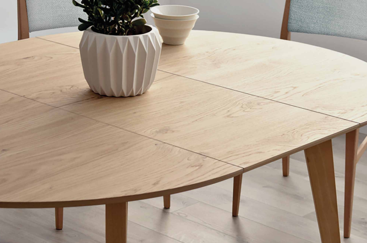 Un diseño moderno, muy cálido gracias a la madera natural y además muy práctico por la capacidad de extender el tamaño de la mesa.