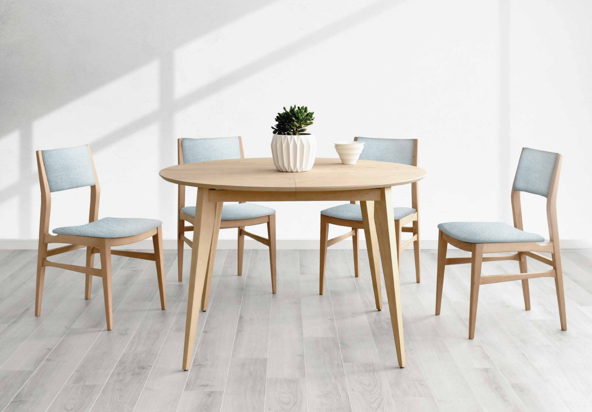 La pata curva de esta mesa de comedor redonda extensible dará un toque muy romántico a tu comedor. Además, como verás en la imagen, no hay problema en combinarla con otras sillas de líneas más rectas.
